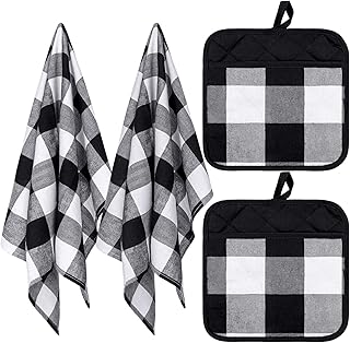 Ruisita 4枚セット バッファローチェック ディッシュタオル 鍋つかみセット 特大 18 x 28インチ コットン キッチン ディッシュタオル 格子柄 布 手袋 ポケットセット キッチンコレクション チェック柄 ギフトセット